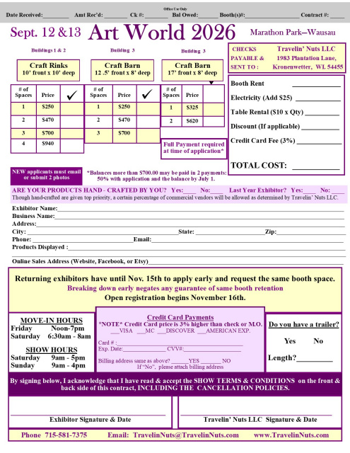 Over 30 years and over 30,000 annual attendees! With three big buildings and hundreds of vendors, Art World is the largest of 4 events creating the biggest craft and gift selling event in Central Wisconsin. This event is completely indoors and free from the worries of weather. Customers and vendors come from across the country to participate in the craft and gift spectacular that is Art World!